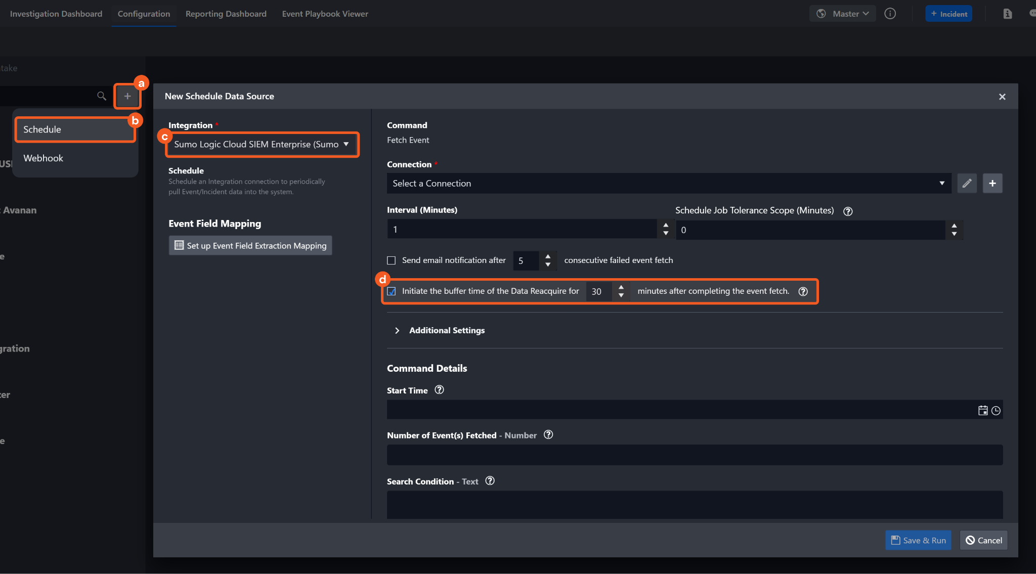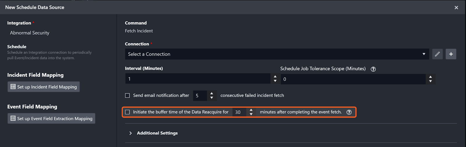 Tolerance Scope | Optional | Note: Instead of using tolerance scope, it is recommended to check the Initiate the buffer time of the Data Reacquire for [x] minutes after completing the event fetch checkbox when setting up a new Data Ingestion schedule. A time window (in minutes) that extends the time range for fetching events by subtracting from the specified start time. Tolerance scope helps prevent data loss by accounting for API response delays caused by temporary server-side data unavailability—arising from processing and synchronization—from the vendor. With the tolerance scope applied, events will be fetched within the range of (Start Time - Tolerance Scope) to End Time. By default, the tolerance scope is set to 0. | 10 |