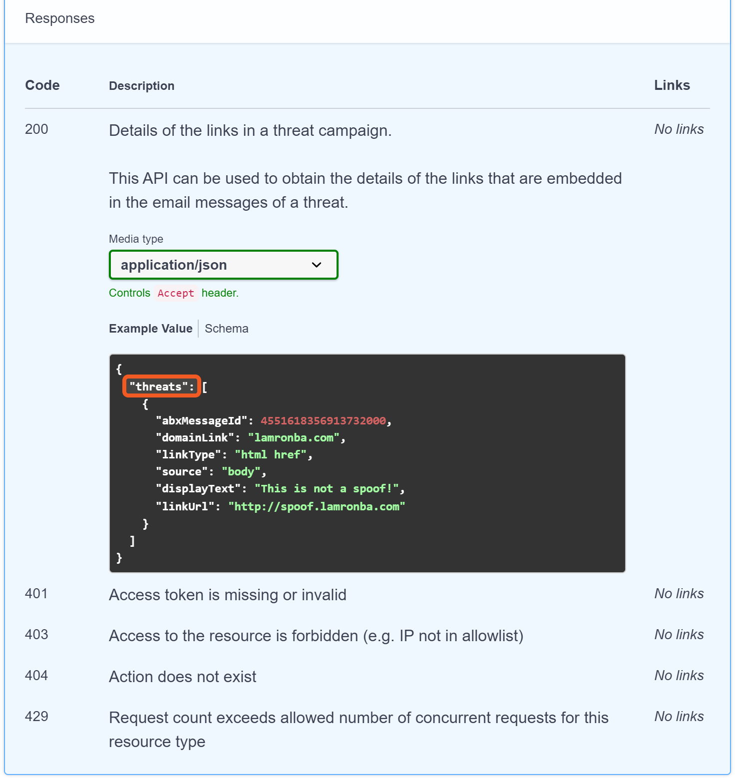 [December 2023]: The 200 response code example for the /threats/{threatId}/links API endpoint contains an error. The top-level JSON path field is incorrectly specified as $.threats; it should be $.links.