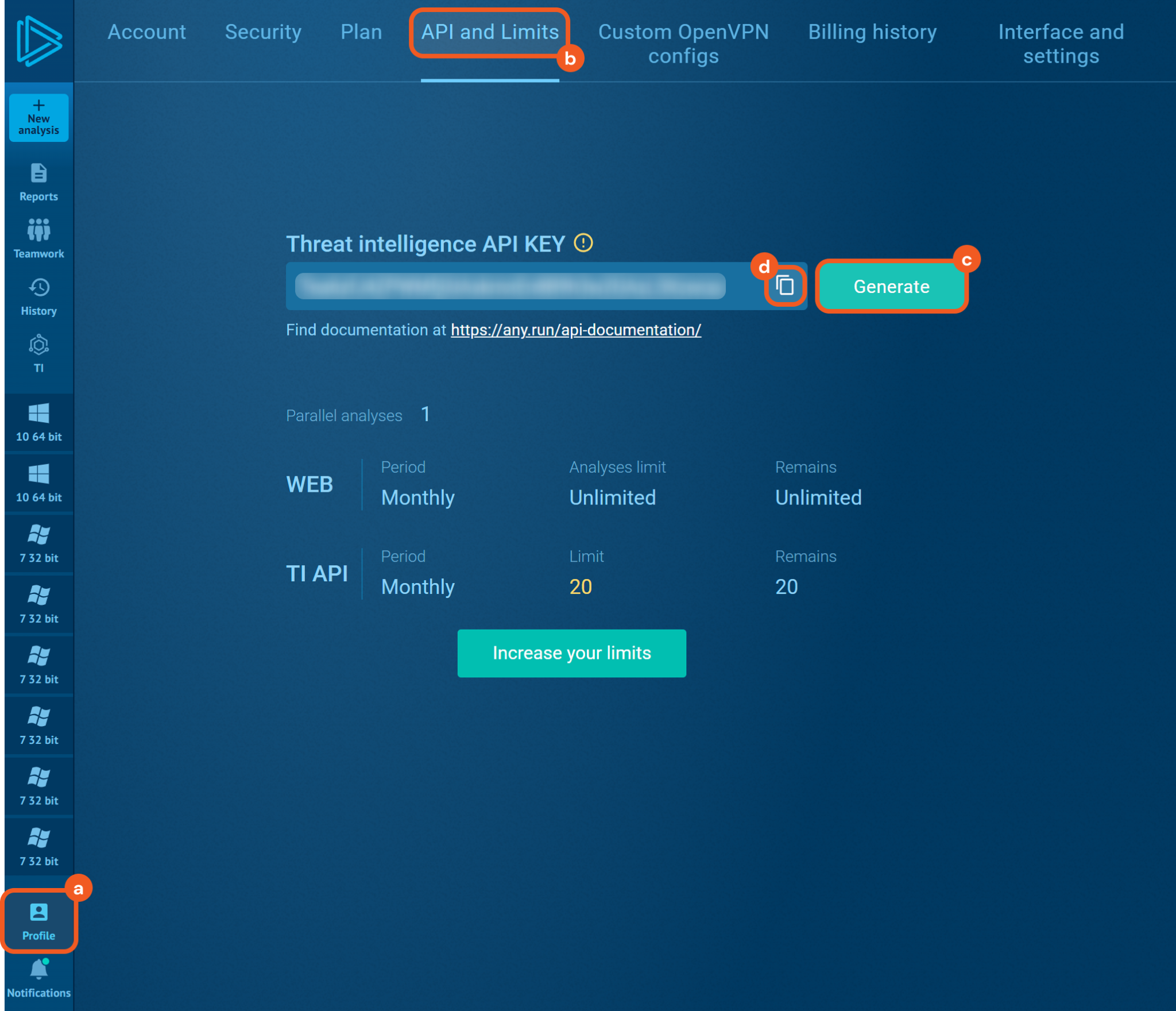 ANY.RUN enforces API rate limits based on the subscribed plan: