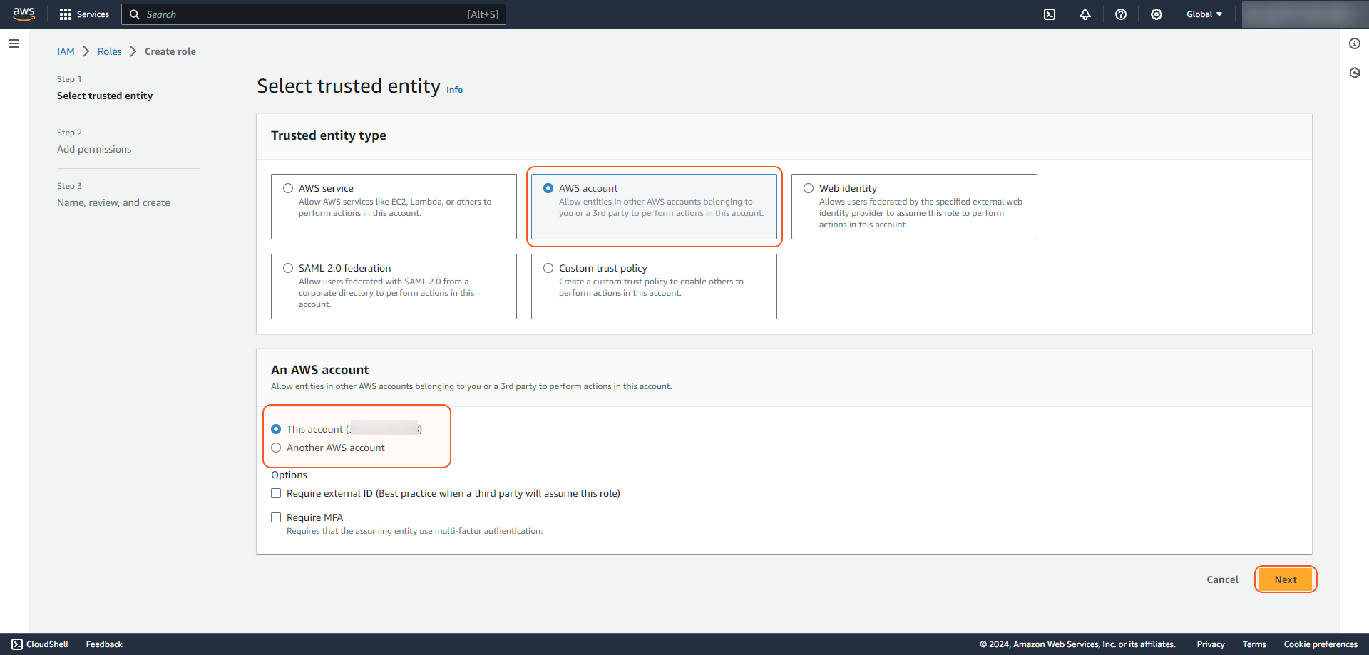 Select AWS account under Trusted entity type. Choose the appropriate account under An AWS account, then click Next.