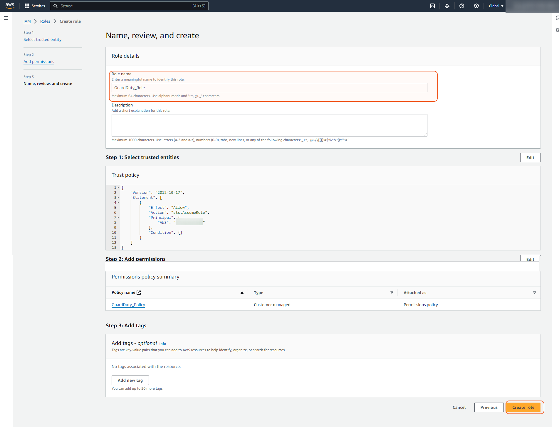 Default Role ARN | The Amazon Resource Name (ARN) of the role to assume can be obtained from IAM in the AWS console. Note that for assuming a role, ensure that the assumed role has the necessary permissions to execute related commands. Additionally, the assumed role must trust the account you're using for the connection. Please refer to Editing the trust relationship for an existing role - AWS Directory Service. | arn:aws:iam::*****:role/d3guarddutyrole |