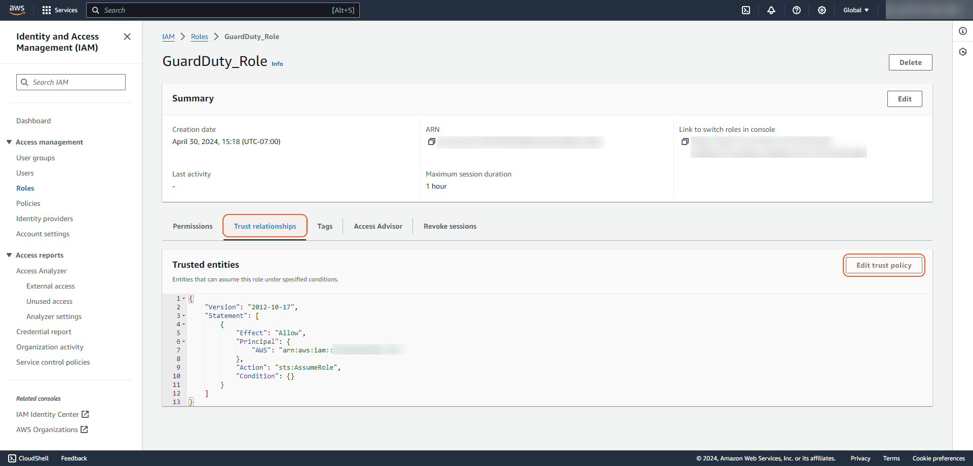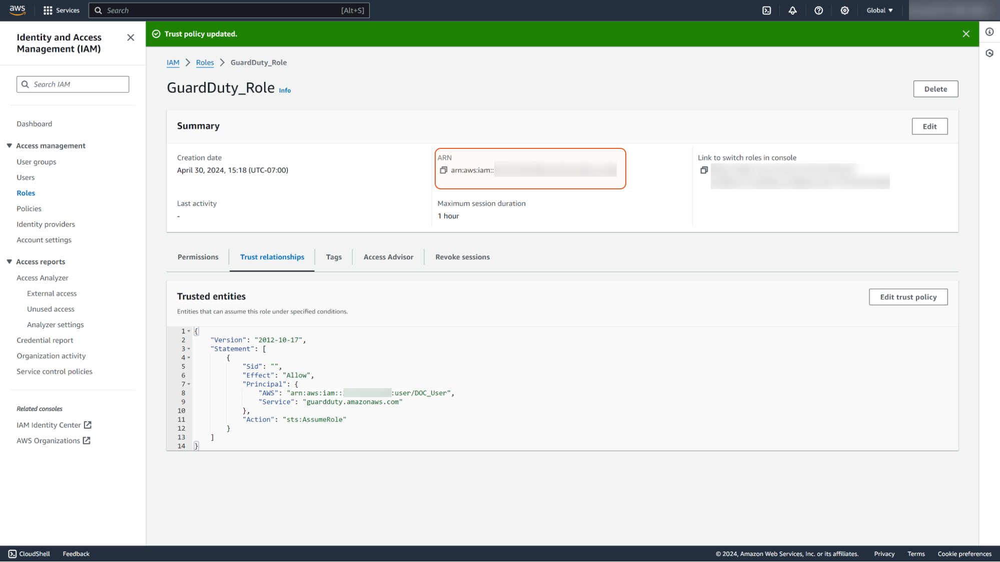 CODE{ "Version": "2012-10-17", "Statement": [ { "Sid": "", "Effect": "Allow", "Principal": { "AWS": "arn:aws:iam::******:user/DOC_User", "Service": "guardduty.amazonaws.com" }, "Action": "sts:AssumeRole" } ] }