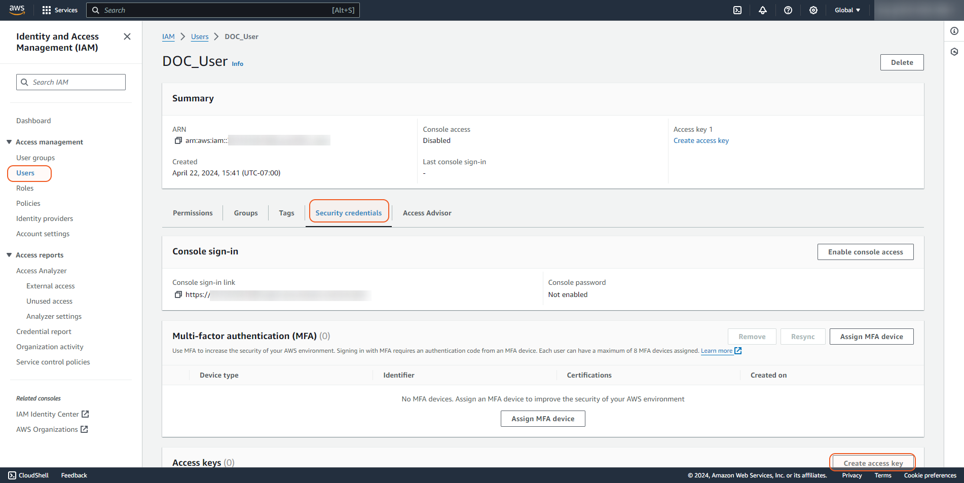 Copy the Access key ID and the Secret access key to use to connect with D3 SOAR.