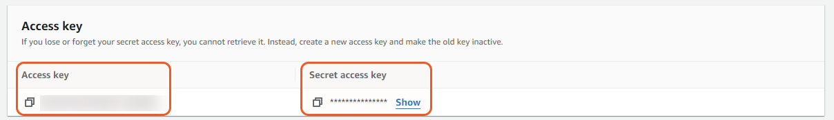 The secret access key is not retrievable after this point. Download the CSV immediately and store it securely. To obtain another key, create a new access key and deactivate the old key. A maximum of two access keys, active or inactive, is allowed.