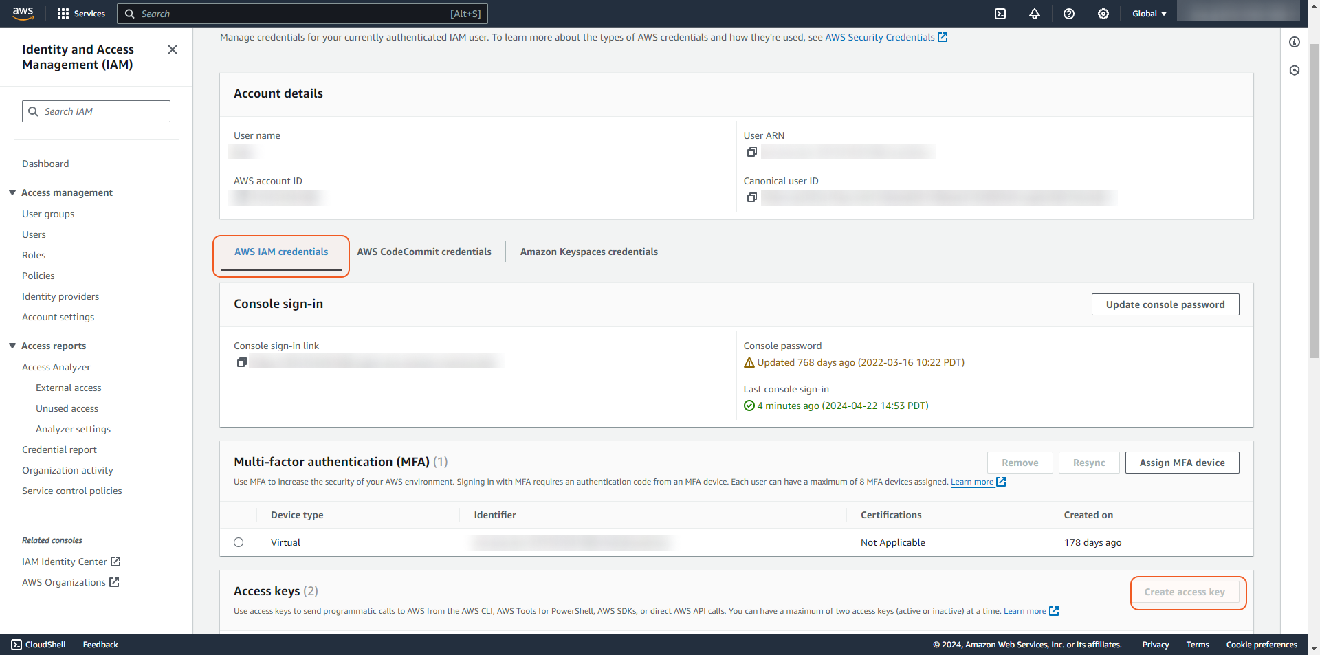 If necessary, contact an administrator to obtain permission to read or create access keys.