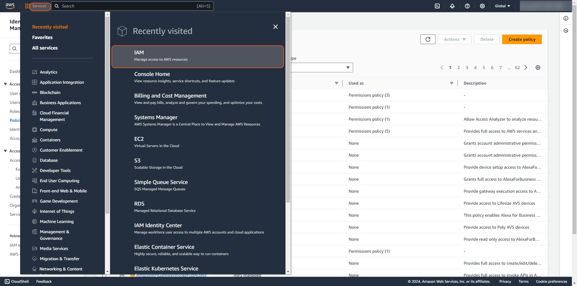 Click on Services, which will expand the navigation menu. Then select IAM.