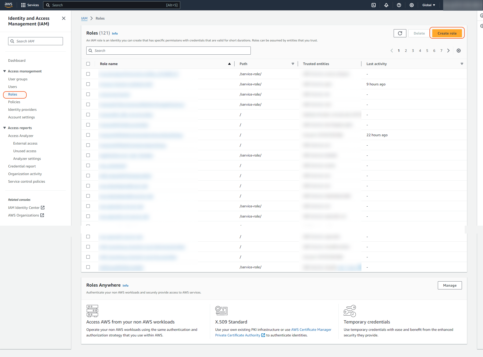 On the left side menu, click Roles and then click the Create role button at the top right.