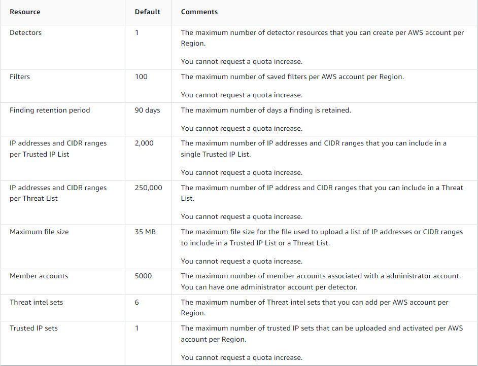 Refer to Quotas for Amazon GuardDuty for detailed information.
