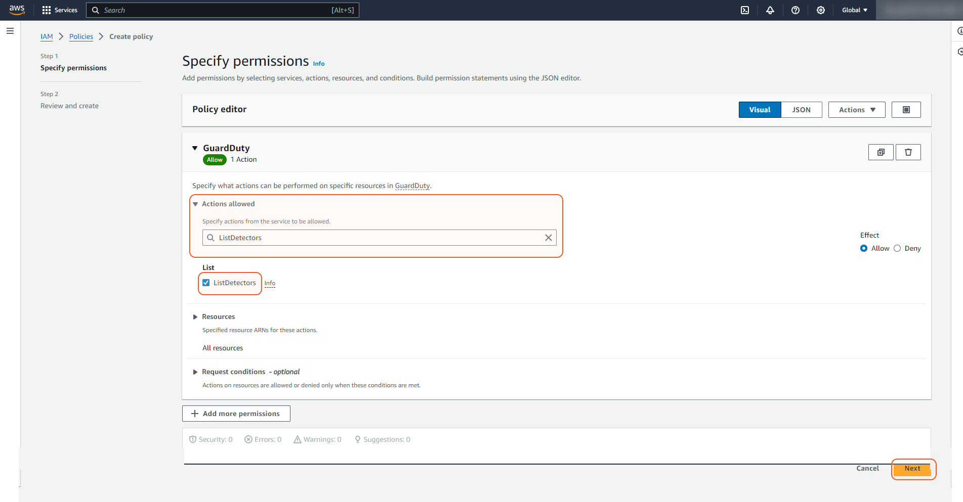 Search and assign using the search box in the Actions allowed section. For example, search for ListDetectors in the search box, and use the tick box underneath to select this action. Refer to Permission Requirements for the necessary Access level (Actions). It is possible to specify multiple permissions under the same policy. Then click Next.