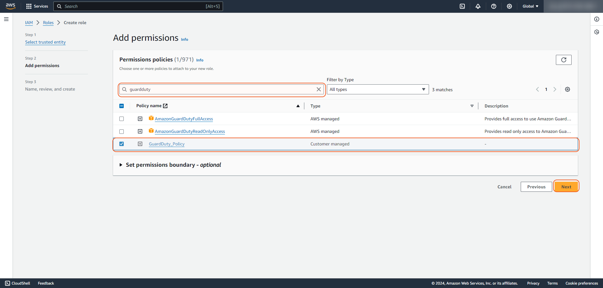 Use the search box to search for the policy name. Add the required permissions by selecting the policy, then click Next.