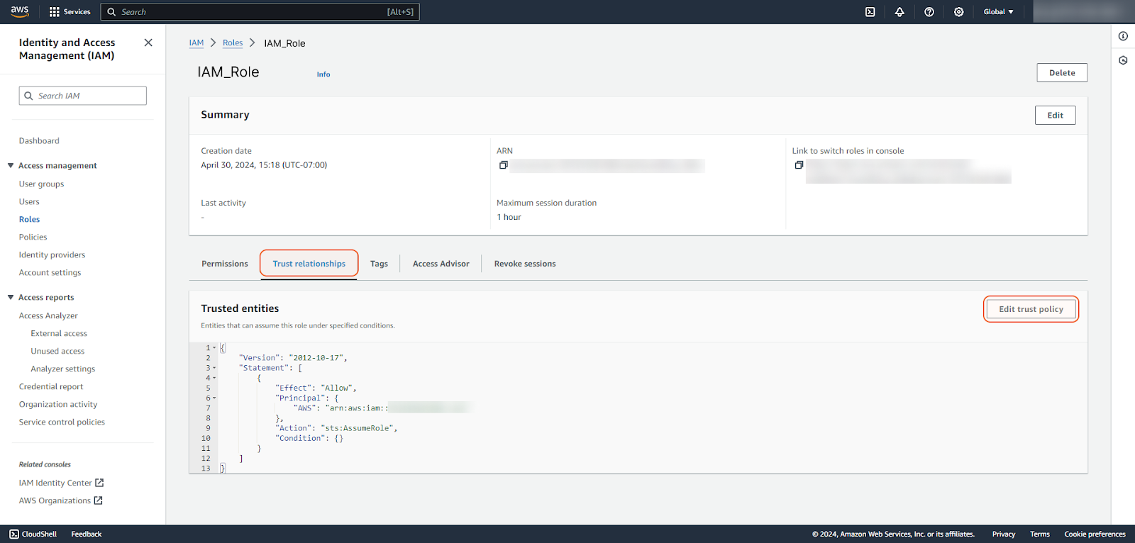 Navigate to Roles and select the tab Trust relationships. Click Edit trust policy.
