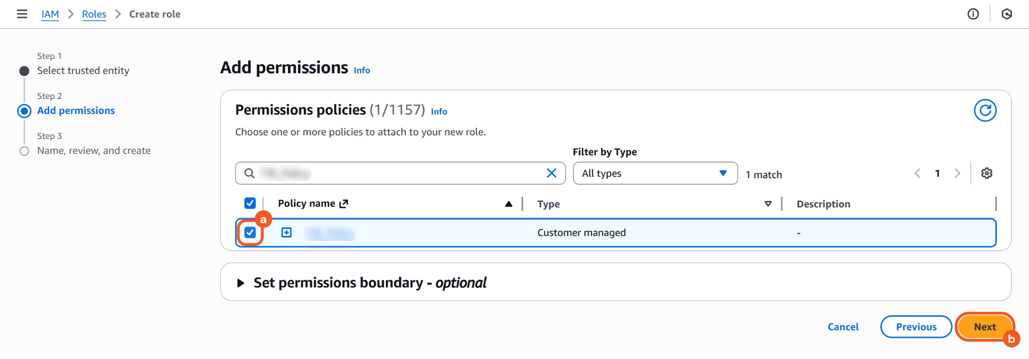Search for the policy in the Attach permissions policies - Optional section.