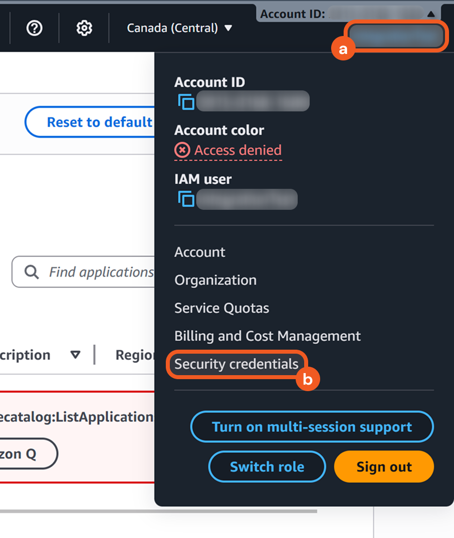 Click the account icon at the upper-right corner of the AWS Management Console, then select the Security credentials option.
