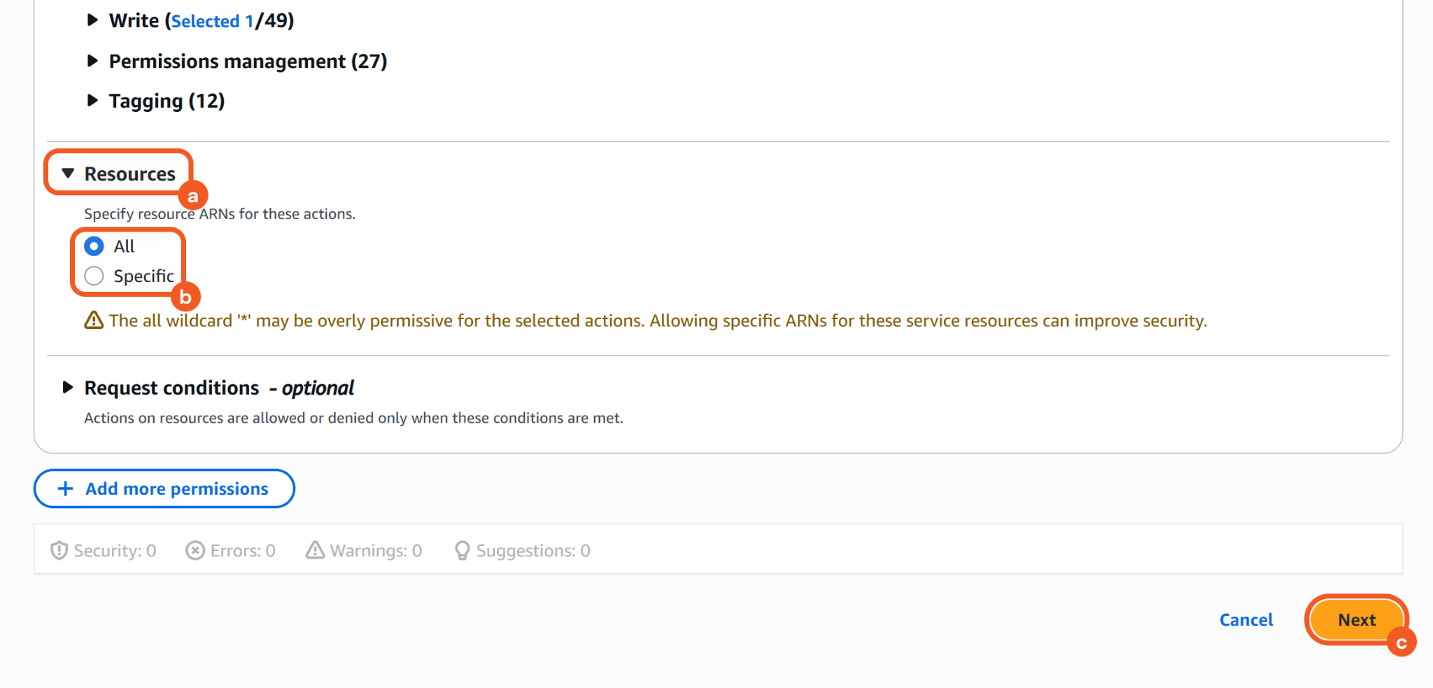 Select either the All option or the specific AWS resources to which the permissions apply.