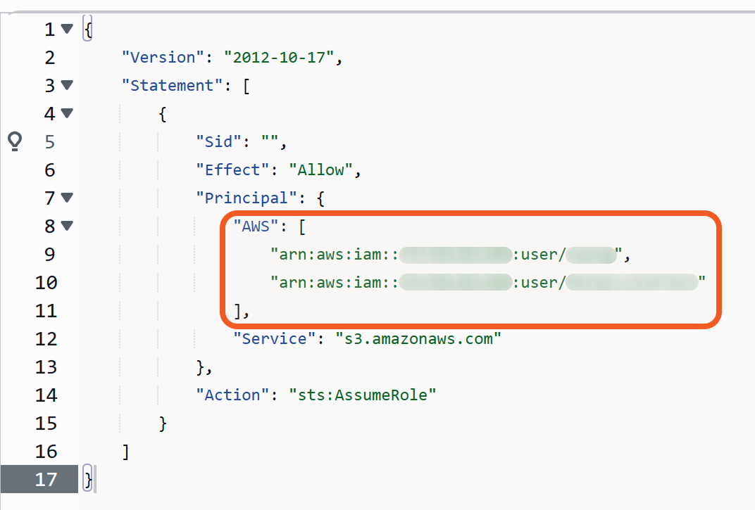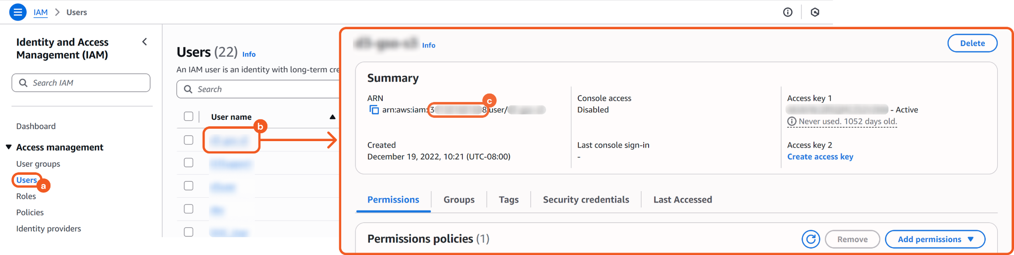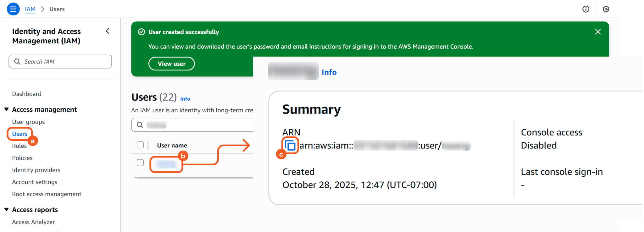 Administrators can obtain a user's Account ID by navigating to Users > [user-name], then referencing the numeric portion of the ARN that appears after IAM::.