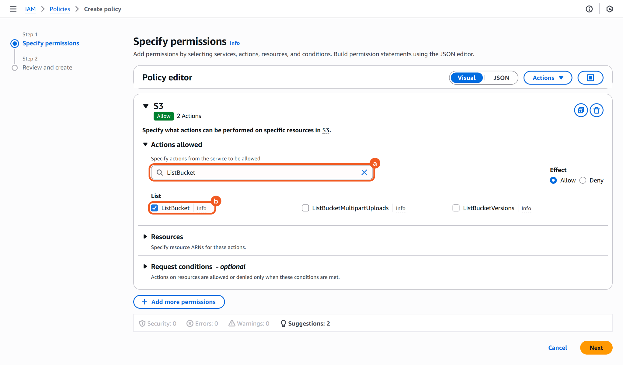 For example, search for and enable the DeleteObject and ListBucket actions to run the Delete Buckets command