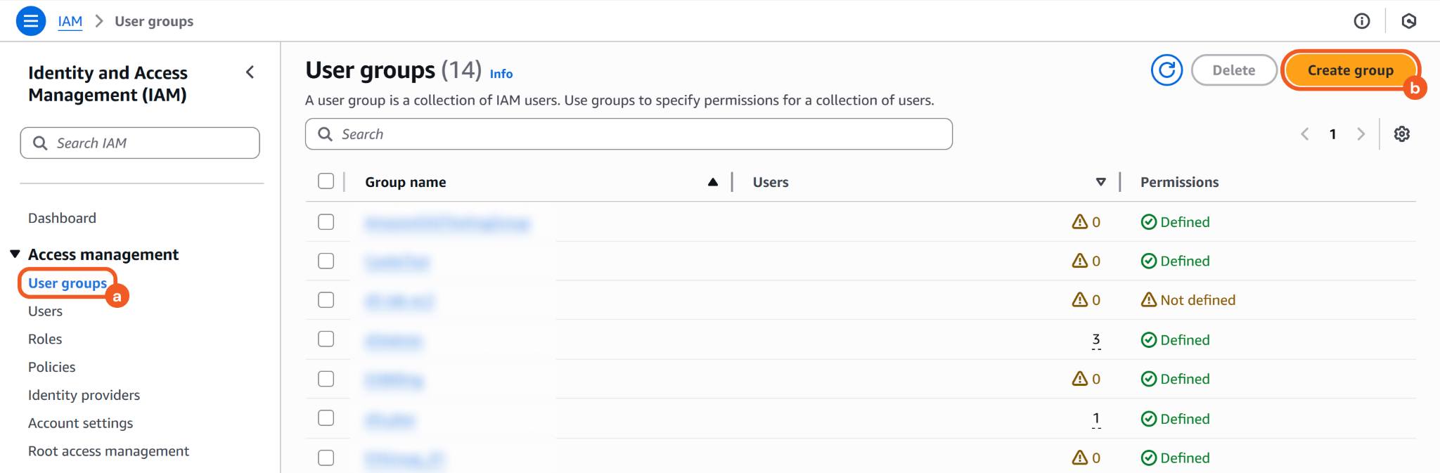 Navigate to the User groups menu item, then click the Create group button.
