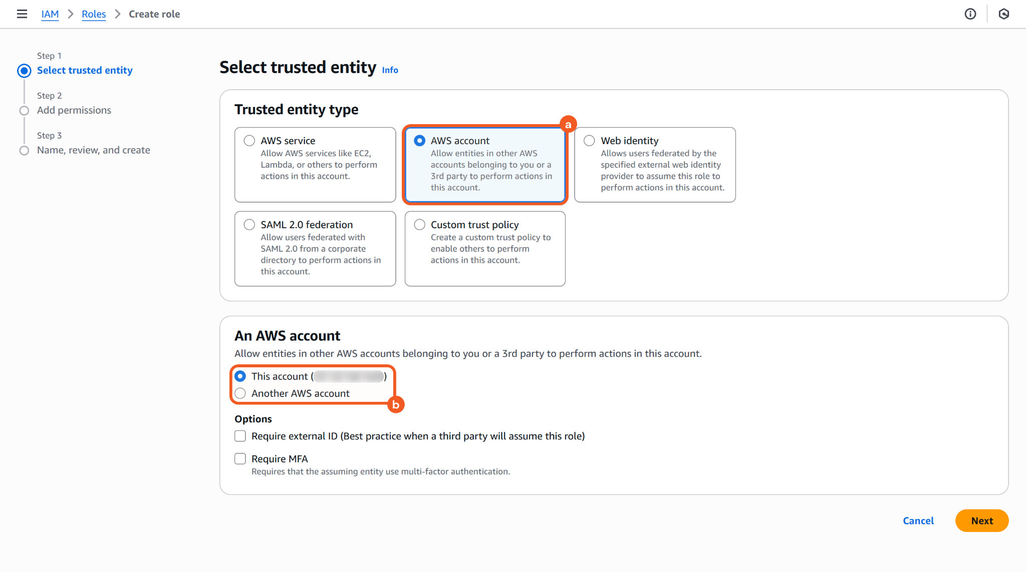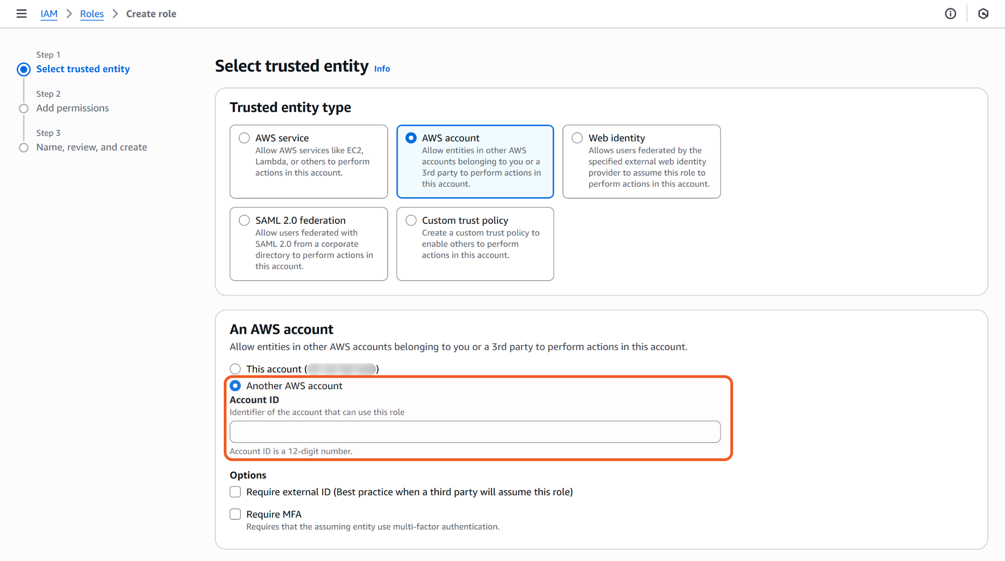 Select the AWS account option, then choose the account that will use this role (i.e., the current account or another AWS account).