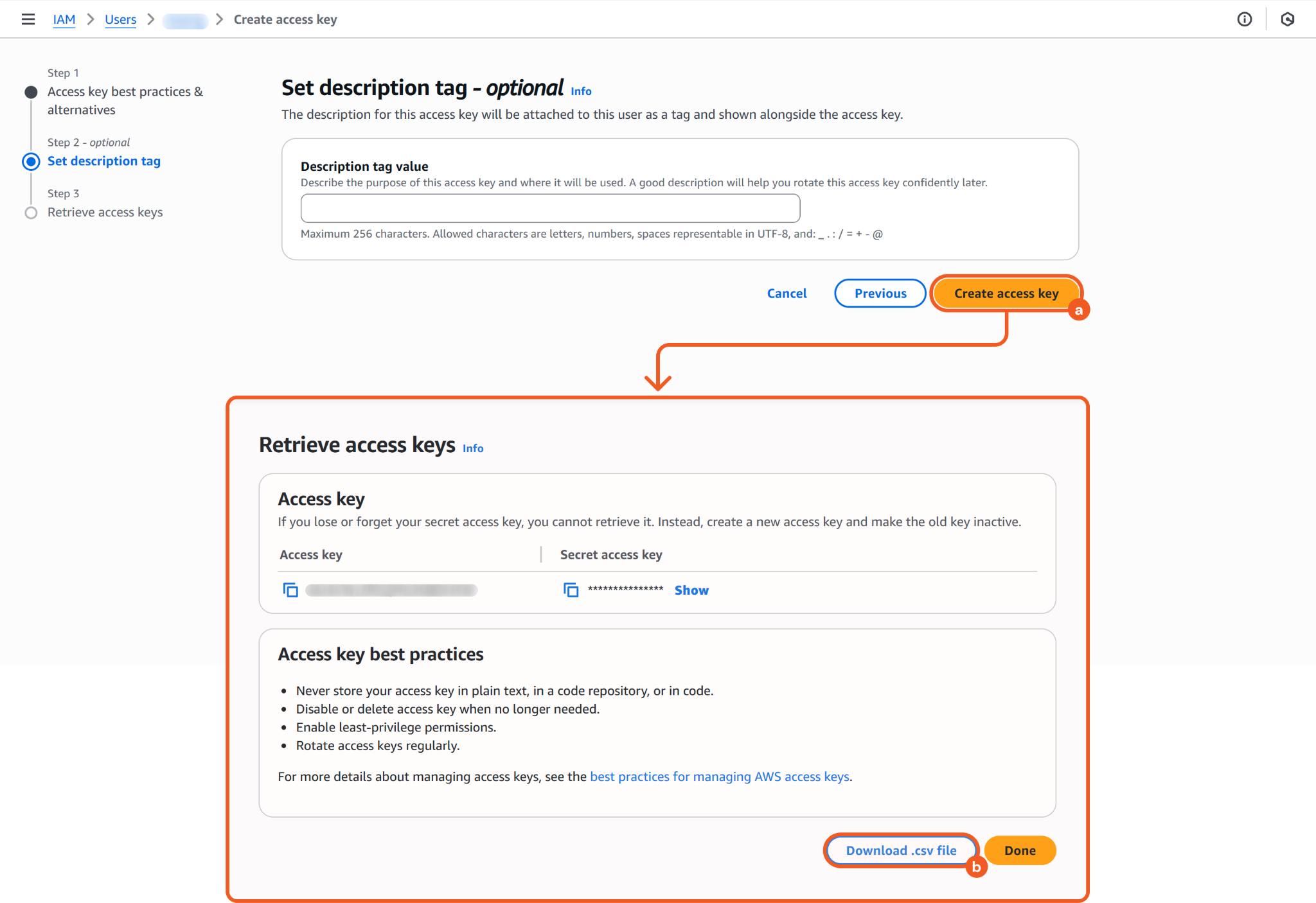 Click the Create access key button, then click the Download .csv file button to save the credentials to the device.