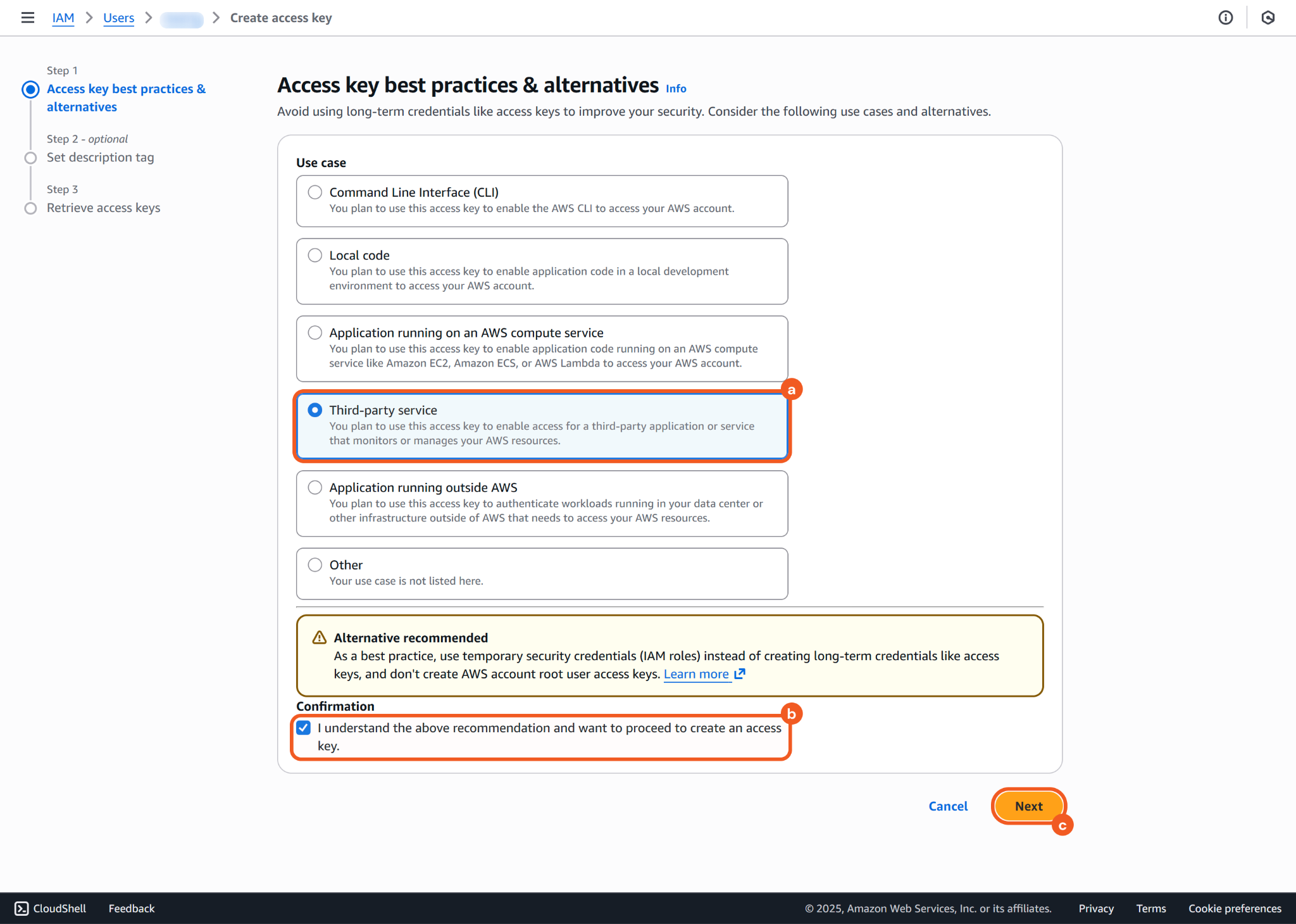 Select the appropriate use case (i.e., Third-party service), check the confirmation checkbox, then click the Next button.