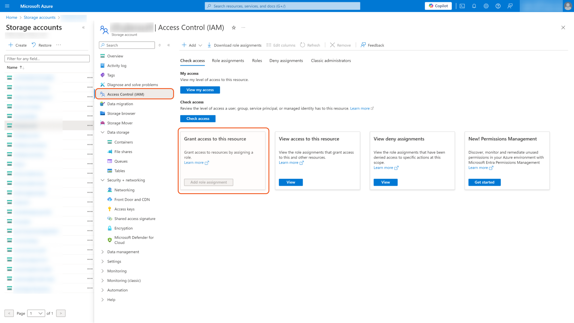 Navigate to the Access Control (IAM) tab, and grant access from the Permission Requirements to the selected resource.