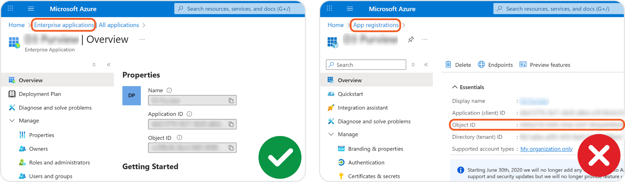 Object ID | Optional | The unique object ID of a security principal in Microsoft Entra ID to which the access policy applies. Object ID refers to the object ID of the application used in the connection, obtained from Enterprise applications in the Azure portal. | b083****c919 |