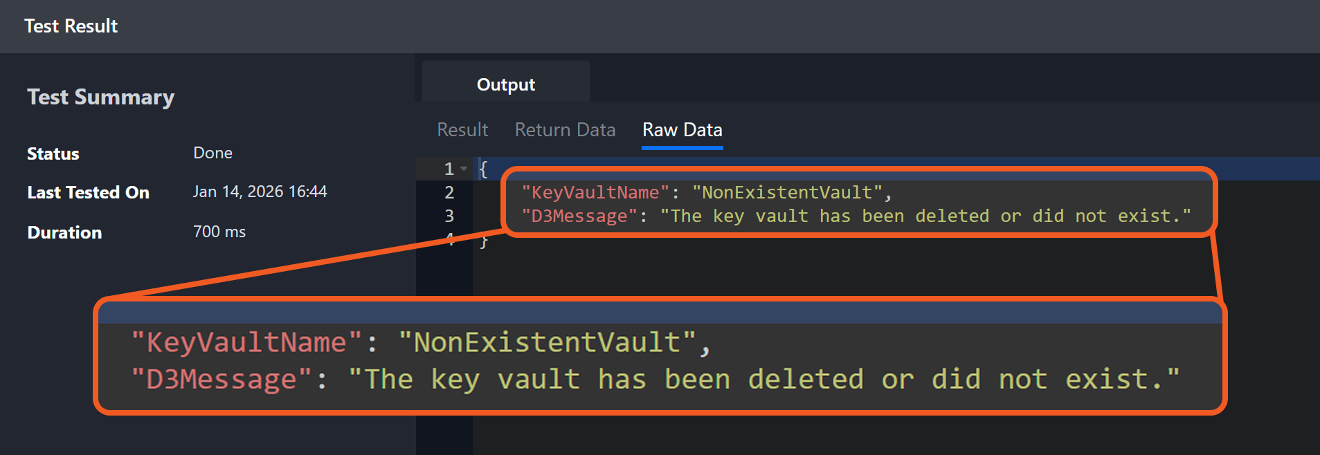 Message | The raw data or captured key error message from the integration API server about the API request failure. | Message: The Resource 'Microsoft.KeyVault/vaults/NonExistentVault' under resource group 'D3Cyber' was not found. For more details please go to https://aka.ms/ARMResourceNotFoundFix. |