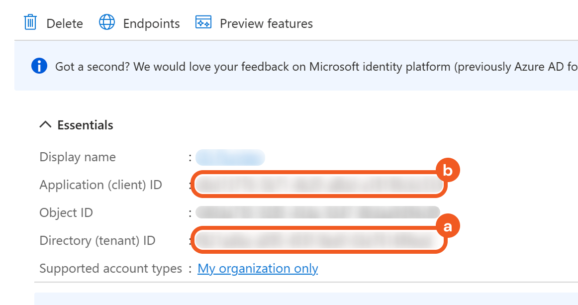 Copy the Tenant ID (a) and Client ID (b) on the Overview page.