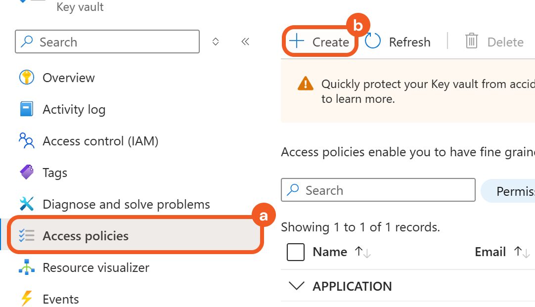 Navigate to the Access policies menu item for the target key vaults, then click the + Create button.