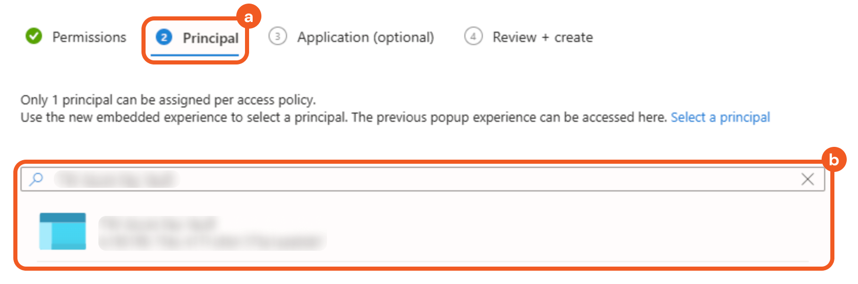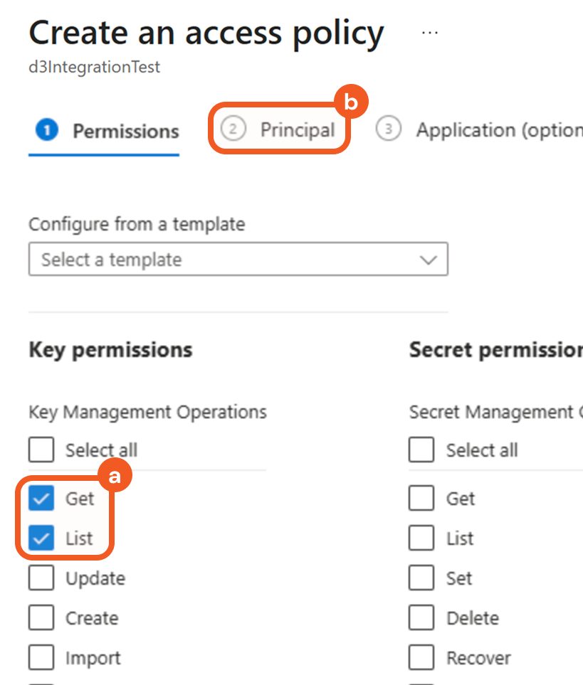 Select the required permissions according to the Permission Requirements table, then click the Principal tab.