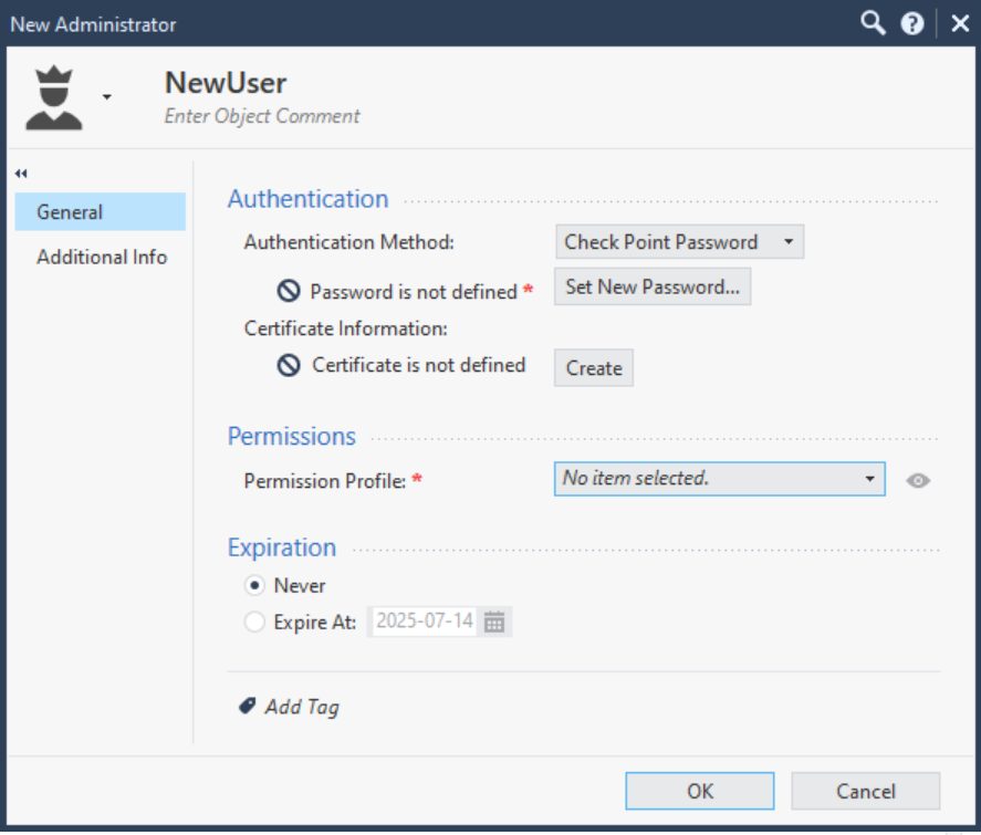 Fill in the required fields for the user details. Ensure to select CheckPoint Password as the Authentication Method in the drop down menu. The Permission Profile dropdown menu defines the role and the user's permissions. Select the role you have created for the user and click OK to create the user.