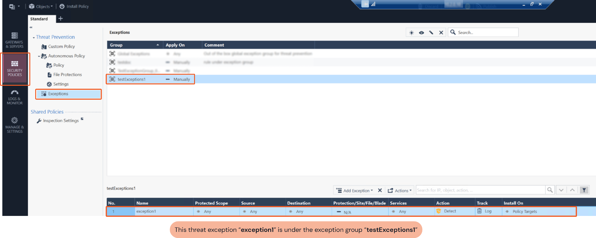 Ensure the input exception group value matches the threat exception. You can use the threat group you choose to check CheckPoint SmartConsole. Navigate to Security Policies > Exceptions to view threat exceptions under their corresponding Exception Groups.