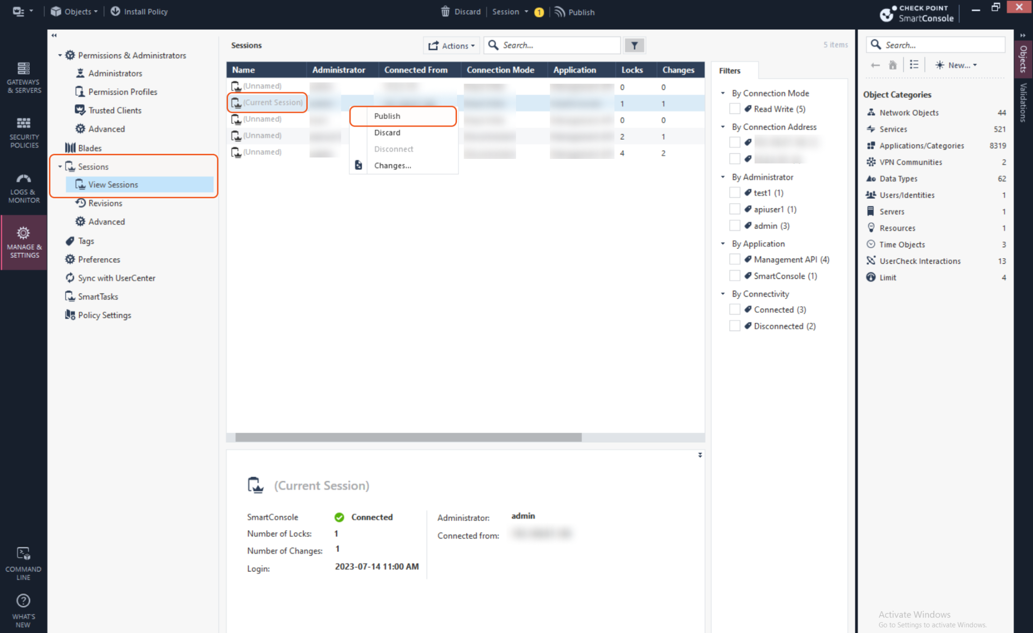 To save the changes, navigate to Sessions > View Sessions in the left sidebar and locate the Current Session. Right click the session and select Publish.