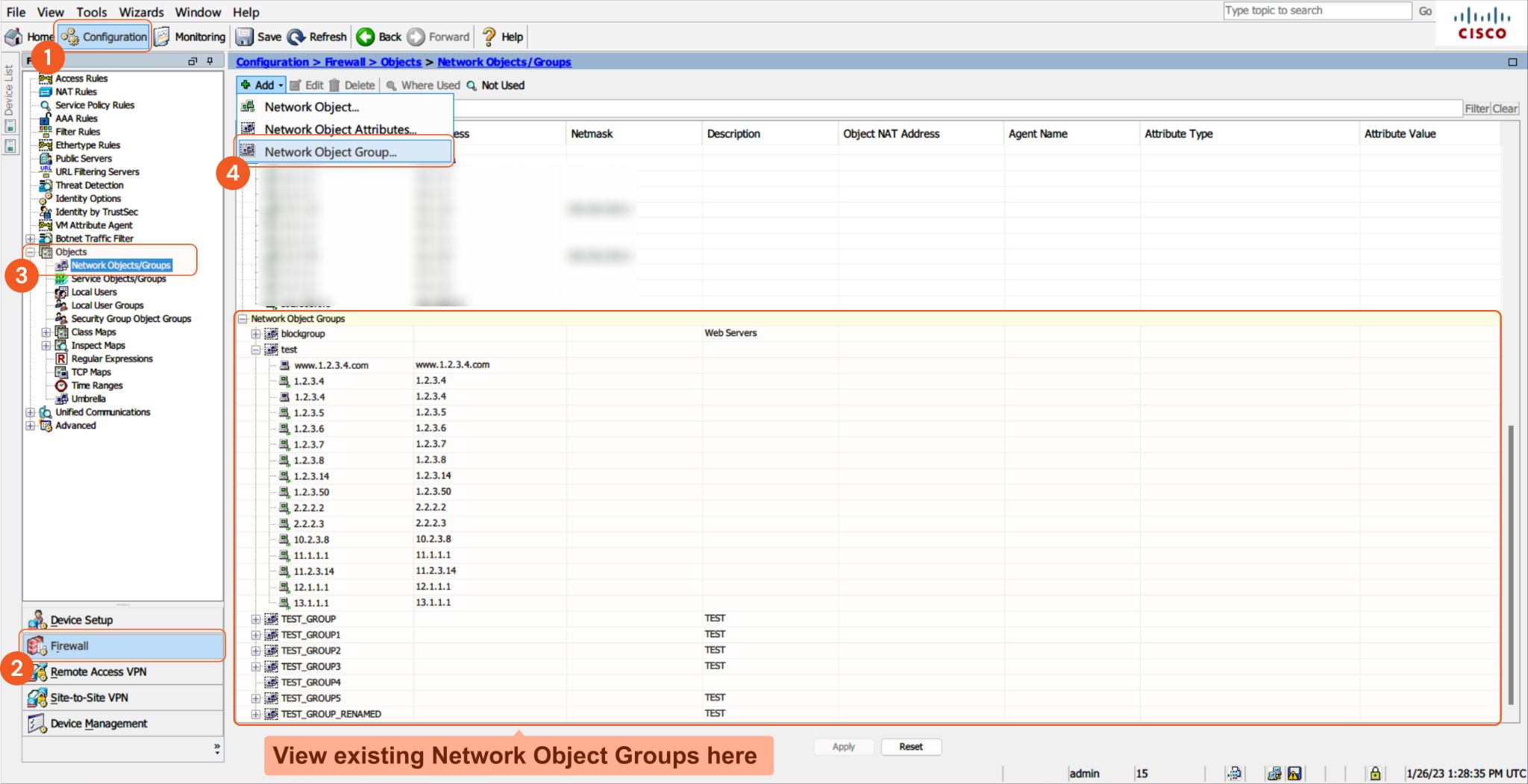 To view the list of blocklist groups, navigate to Configuration > Firewall > Objects > Network Objects/Groups from the Cisco ASA user interface. To add a group, click Add Network Object Group.To view the IP addresses within a group, navigate to the Network Object Groups section at the bottom, and expand the desired group by clicking the "+" sign.