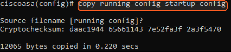 Enter copy running-config startup-config to confirm the source file name, then press enter again to save the current active configuration.