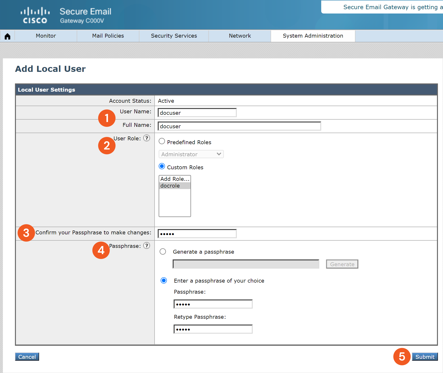Custom user: Custom user role accounts can only access email security features assigned to the role. These features can be any combination of DLP policies, email policies, reports, quarantines, local message tracking, encryption profiles, and the Trace debugging tool.
