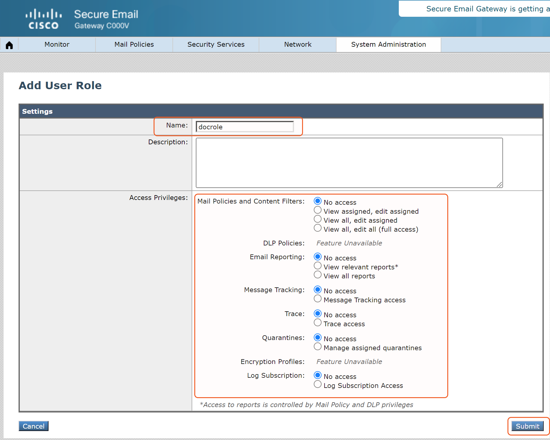 Name the role and configure the required Access Privileges. Click Submit to save the changes.