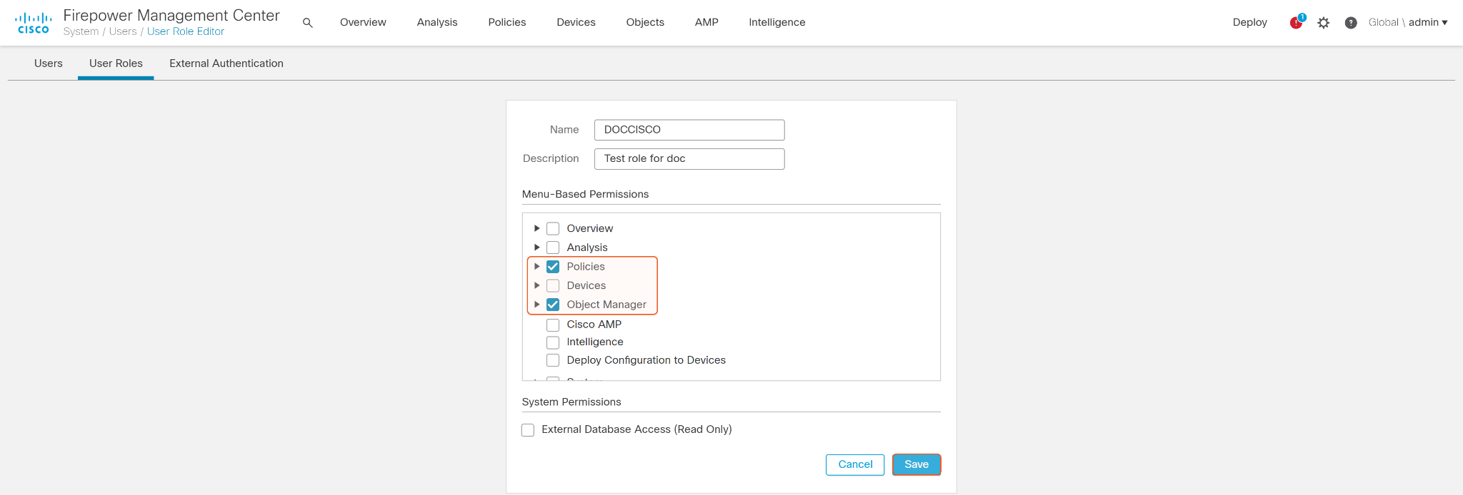 As CISCO Firepower is using role-based access control (RBAC), the API access token is generated based on a specific user account and the application. Therefore, the command permissions are inherited from the user account’s role. Users need to configure their user profile from the CISCO Firepower console for each command in this integration.