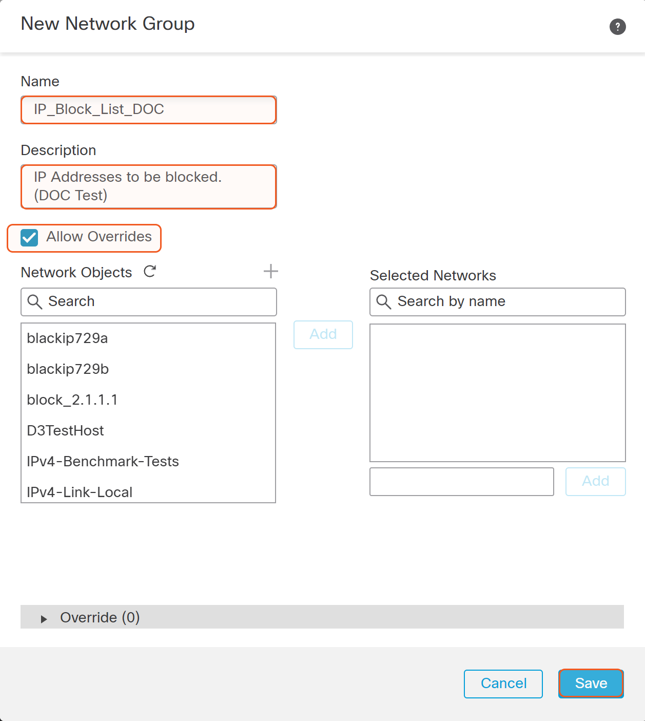 In the pop-up window, enter the Name and Description for the IP Block List. Add existing network objects to the list or check Allow Overrides and just leave the list blank. Then click Save.