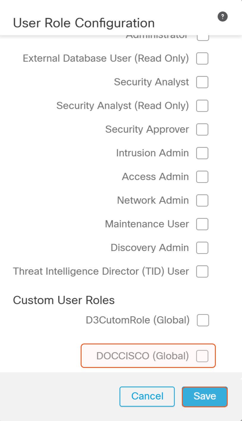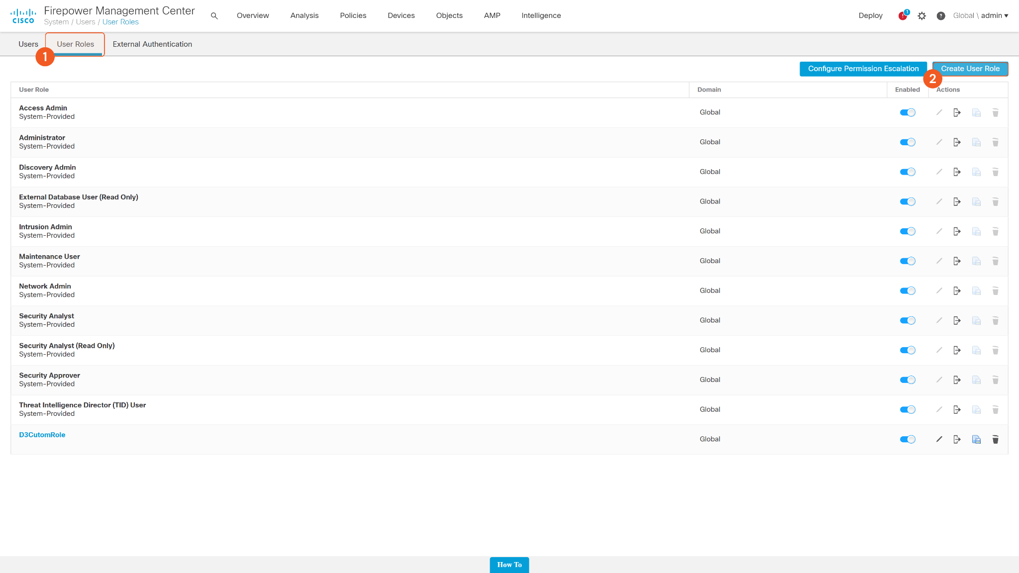The permission requirements in the table above are policies. If the default roles do not meet the requirements, these policies can be used to create custom roles for users. Refer to Configuring CISCO Firepower to work with D3 SOAR for details.