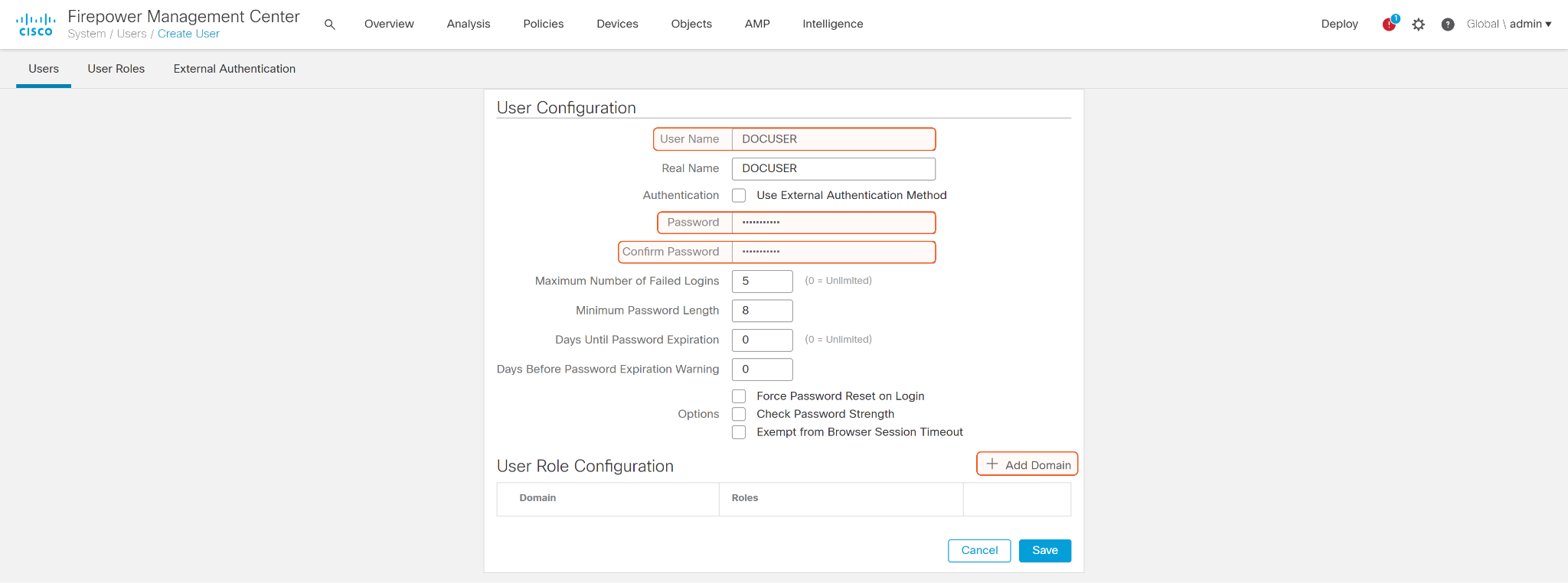 Enter a User Name and Password. Click + Add Domain to grant user roles.