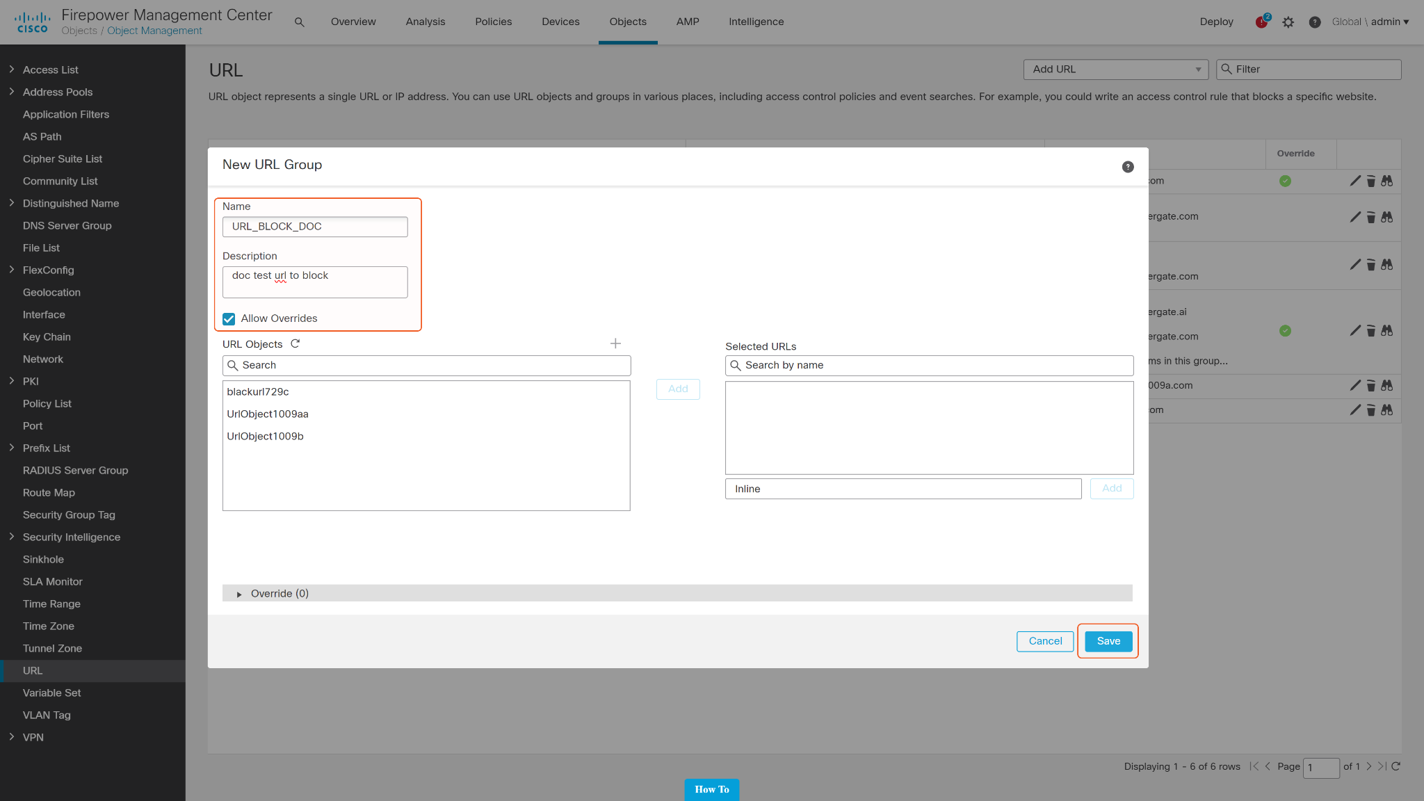 In the pop-up window, enter the Name and Description for the URL Block List. Add existing URL objects to the list or check Allow Overrides and just leave the list blank. Then click Save.