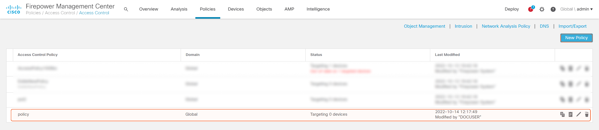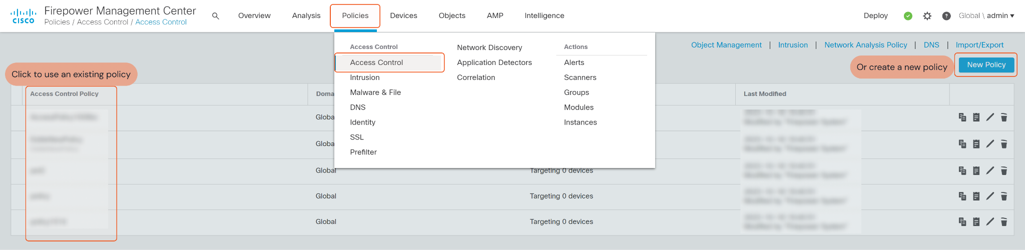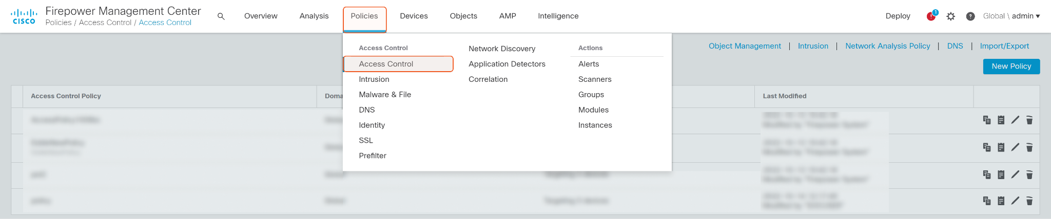 Attach the URL Block List to a policy. Click Policies on the top, then select Access Control on the dropdown list. Select a policy on which to attach URL Block List, or create a new policy by clicking New Policy on the top right corner.