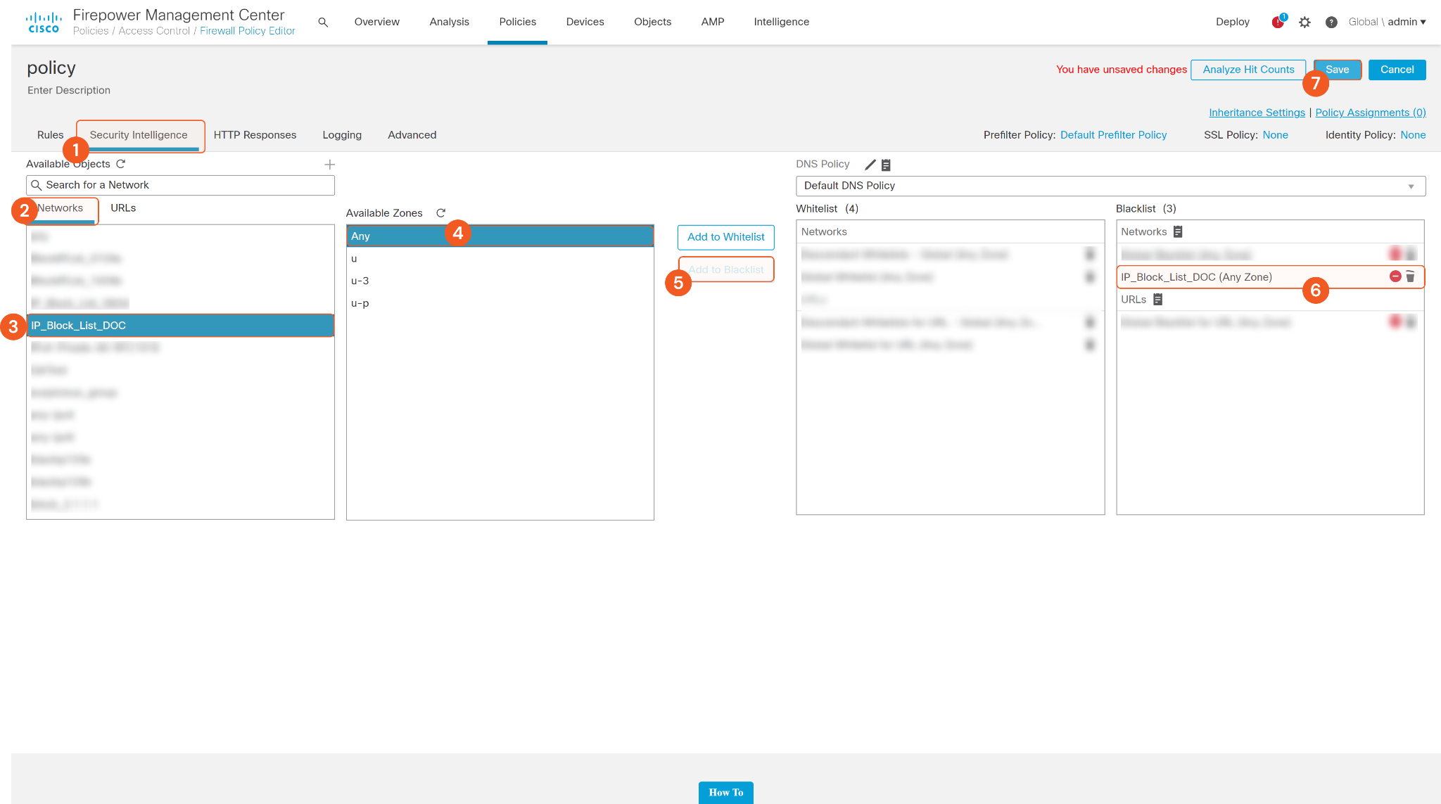 In the Security Intelligence tab, go to the Networks tab, then select the newly created IP Block List, and set Available Zones to Any, then click Add to Blacklist to attach the IP Block List that was just created to the Blacklist. After you click that button, the IP Block List will show in the Blacklist box. Click Save to save the changes. The IP Addresses will be blocked if they are added the IP Block List in the policy blacklist.