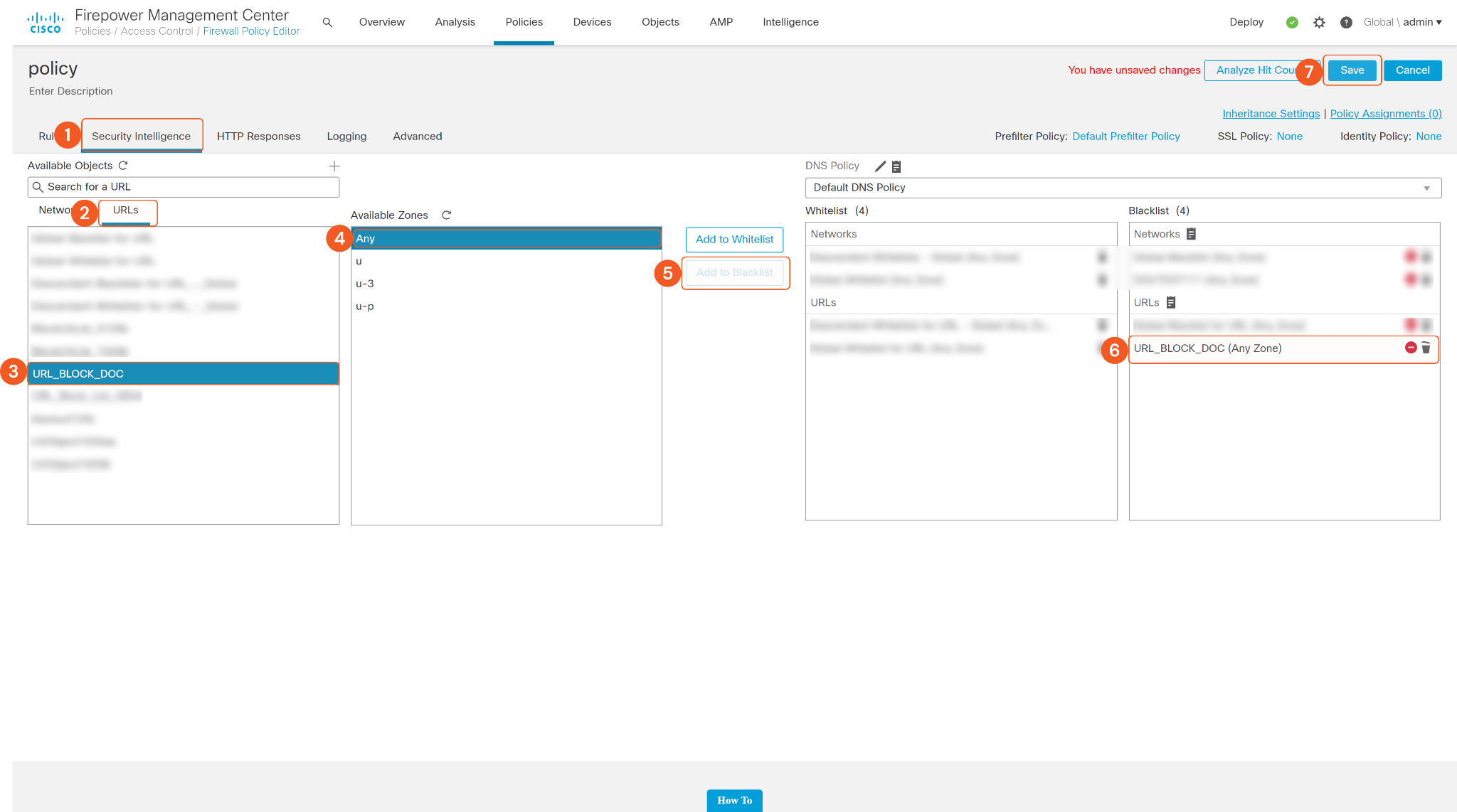 In the Security Intelligence tab, go to the URLs tab, then select the URL Block List you just created. Set Available Zones to Any, then click Add to Blacklist to attach the URL Block List to the Blacklist. Users should find the URL Block List that they just created is displayed under Blacklist URLs. Don’t forget to click Save on the top right corner to save. If the policy is enabled, the URLs added to the URL Block List will be blocked.