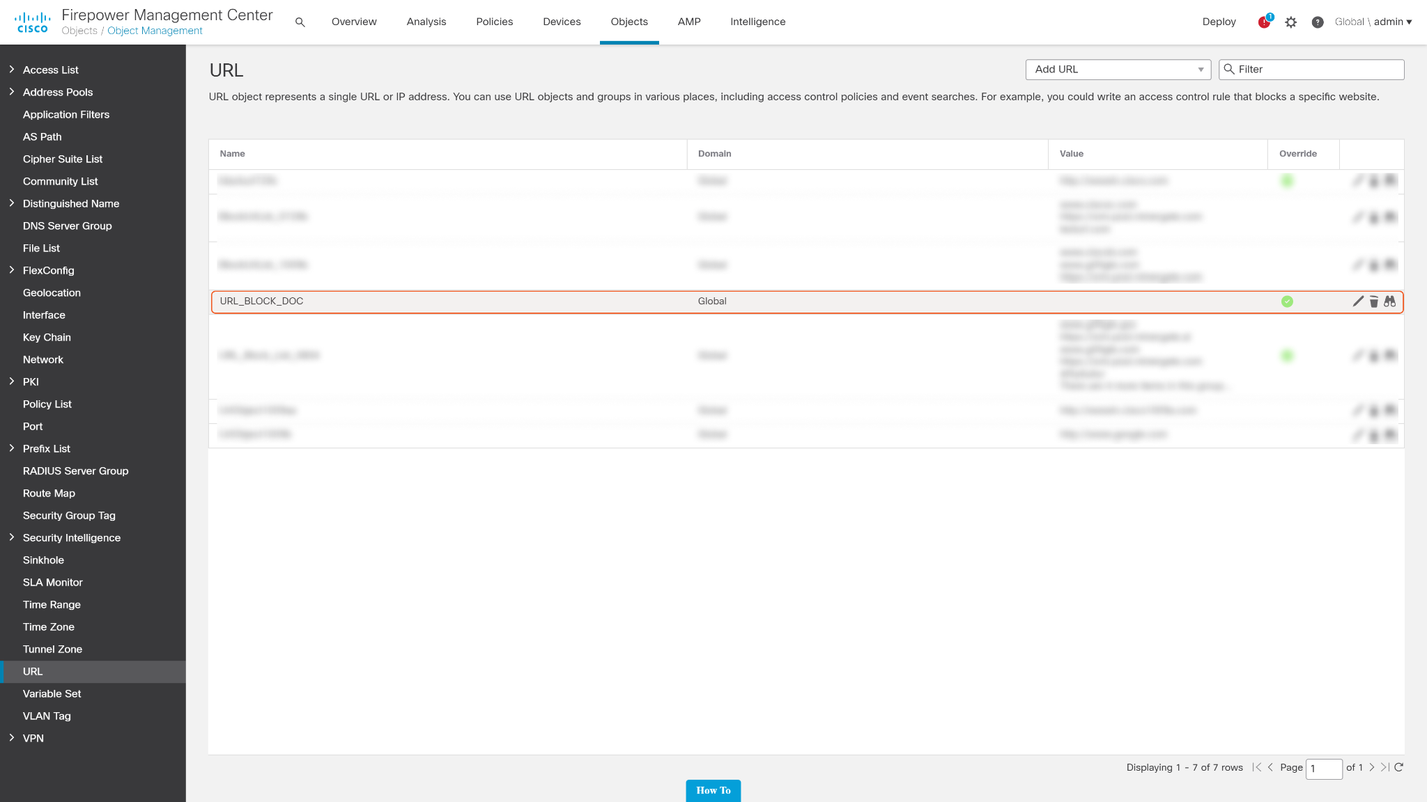 URL Group Name | Required | The URL Group Name of the URL block list. URL Group Names can be obtained in Firepower Management Center obtained under Objects > Object Management > URL. | BlockUrlList_0729b |