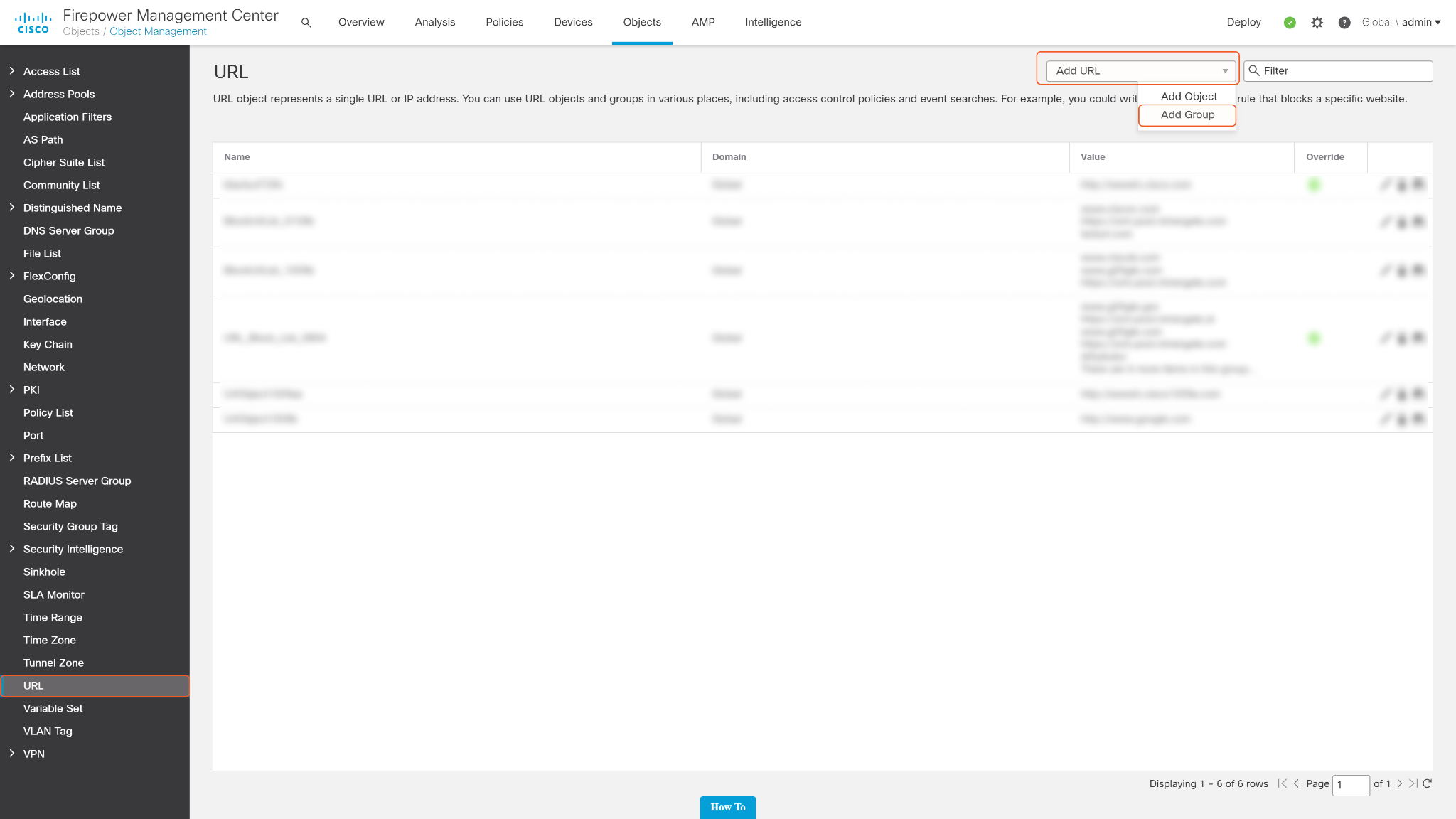 Returns URLs in the URL block list with the URL Group Name. URL Group Names can be obtained in Firepower Management Center under Objects > Object Management > URL.
