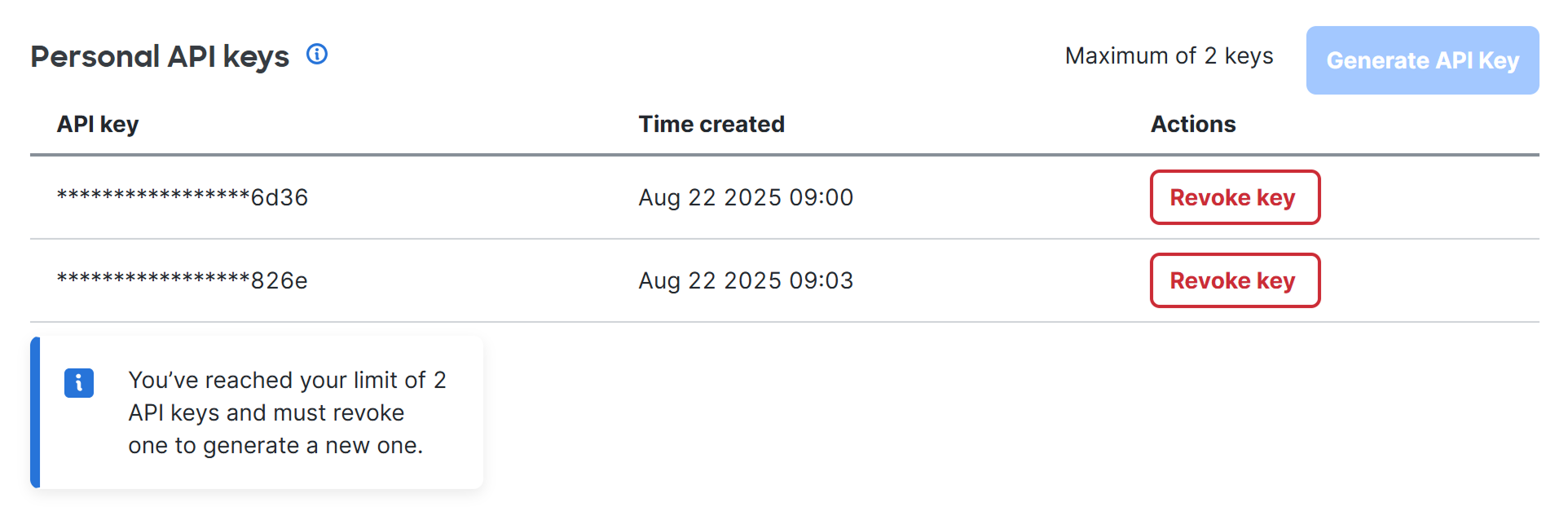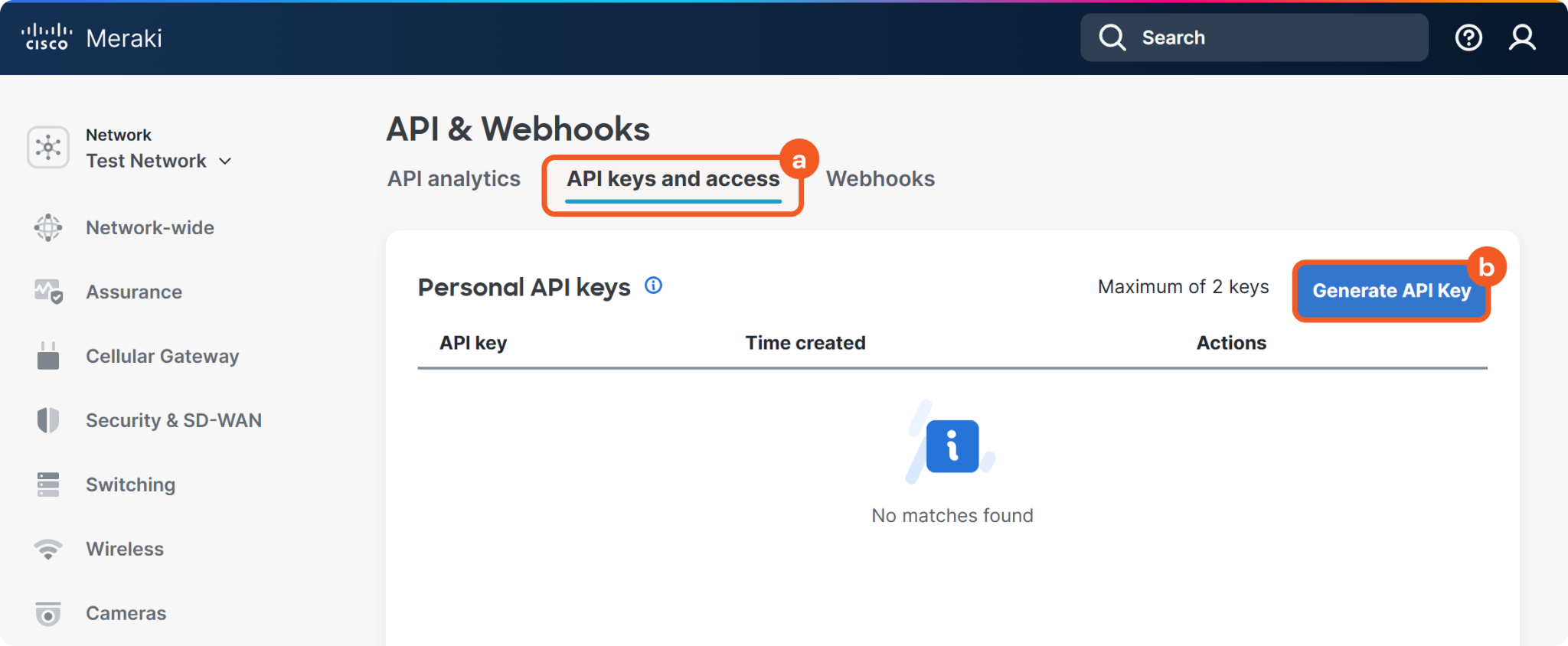 Each Cisco Meraki profile supports a maximum of two API keys. Once two keys are generated, the Generate API Key button becomes inactive. To create a new key, one of the existing keys must first be revoked.