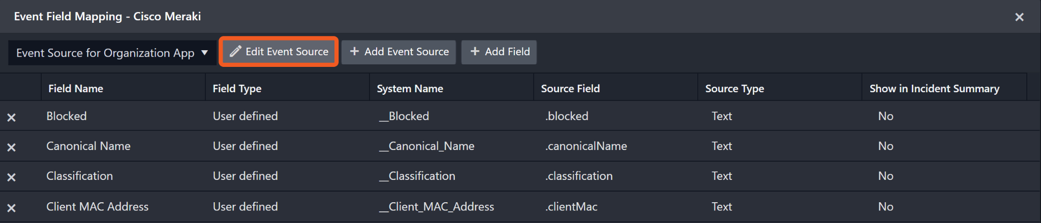 The Cisco Meraki system integration includes pre-configured field mappings for the default event source.