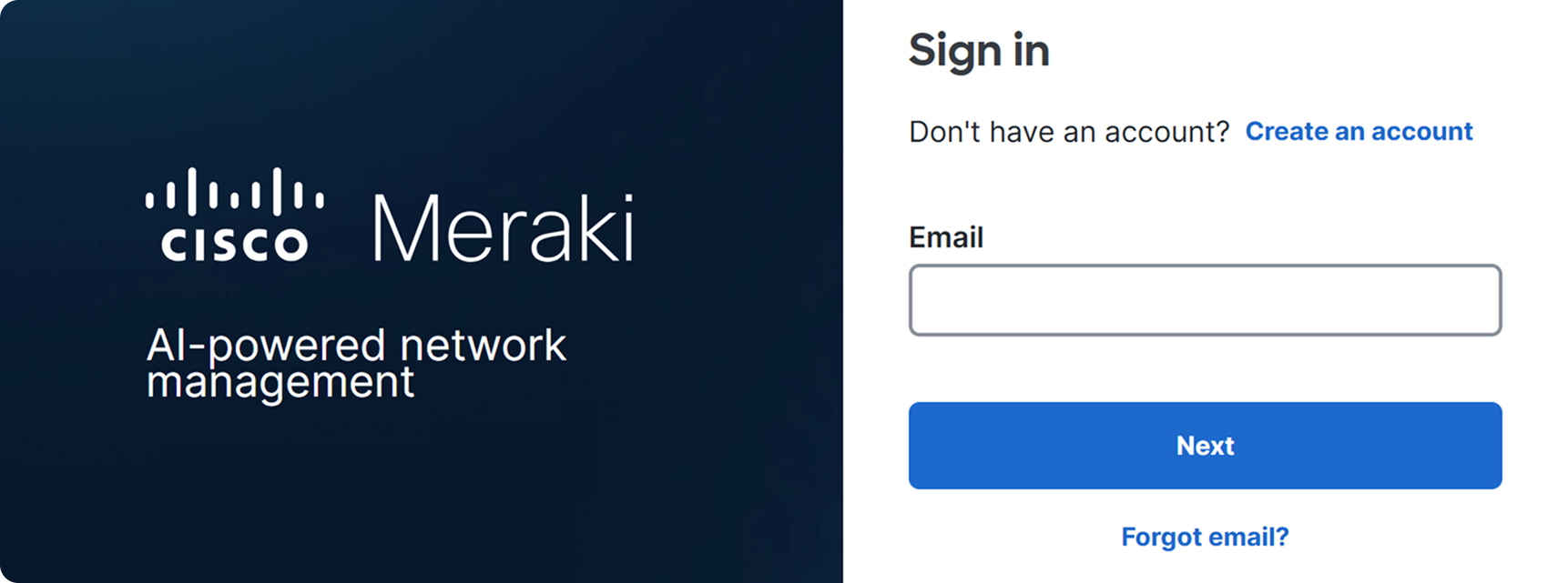Login to Cisco Meraki at account.meraki.com/login/local.